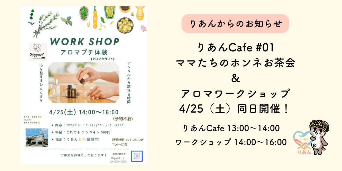 4月25日(土)、りあんcafeと同日に、アロマワークショップも開催します。