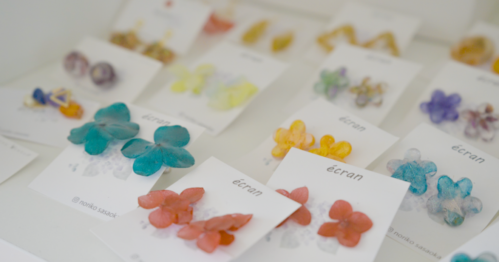 高知県須崎市を拠点に、まるで宝石のように輝くアクセサリーや、生命力に満ちた花雑貨を手掛ける作家、笹岡紀子さん。屋号「ècran(エクラン)」として活動する彼女の作品は、その鮮やかな色使いで、見る人の心に元気と活力を与えます。