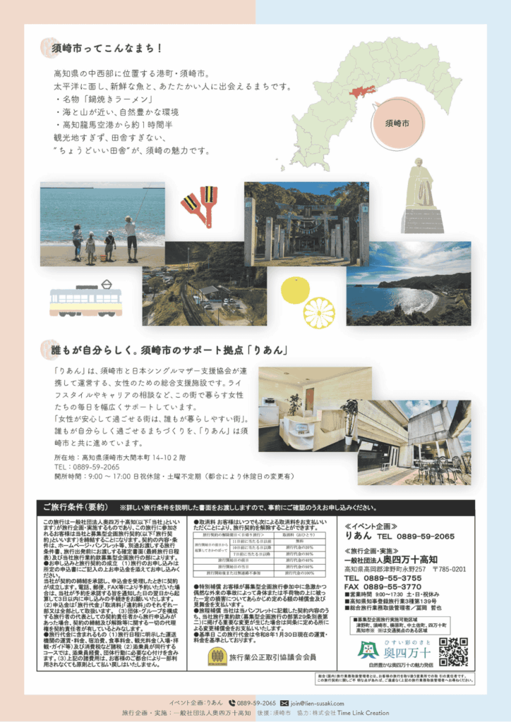 【お知らせ】恋するすさき旅 2026 Spring 3月7~8日開催! 2026 2/09 2026年2月9日2026年2月10日 開催日: 2026年3月7日 11:00 - 2026年3月8日 15:00 婚活より気軽な「恋活イベント」を開催します! 詳細は以下をご覧ください。 チラシをダウンロード(PDF) お申込み・詳細はコチラをクリック よかったらシェアしてね! URLをコピーしました! URLをコピーしました! 【2/11(水・祝)】りあんマルシェ #01 ~親子で楽しめる体験ワークショップ♡~ 開催!(予約不要/参加費・材料費無料)in 高知県須崎市 関連記事 【2/11(水・祝)】りあんマルシェ #01 ~親子で楽しめる体験ワークショップ♡~ 開催!(予約不要/参加費・材料費無料)in 高知県須崎市 2026年1月18日 【オンラインイベント】「うちのまち、実はこんなに素敵なんです♡」~わが街の推し & 子育て知恵袋~ 須崎×春日部 1月16日(金) 2026年1月7日 【セミナー開催】人口減少時代を勝ち抜く「王道経営」とは? ~女性活躍が地方企業の未来を変える~ 2026年1月6日 【須崎市内企業向け特別セミナー開催】なぜ、あの企業には人が集まるのか? 2026年1月6日 【ワークショップ】あなたの”ホンネ”が、すさきのミライを作る!「#恋するすさき(仮)婚活イベント編」開催!12月16日(火) 2025年12月6日 【イベント】愛されるコミュニケーション講座開催! 12月6日(土) 2025年11月18日 【利用者主催イベント】お産を語る会 10月21日(火) 2025年11月14日 【イベント】キャリアも暮らしもあきらめない。地方のリアルを語るオンライン座談会 須崎×鹿角 10月29日(水) 2025年10月31日